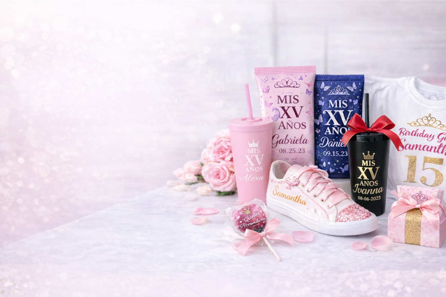 Personalized party favors for quinceaneras. Create the perfect celebration with custom cups,...